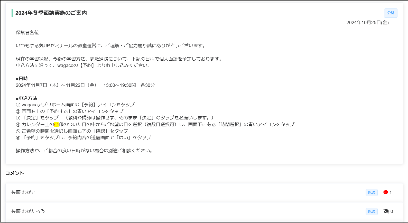 wagacoの予約機能は、授業だけでなく面談日回収ツールとしても活躍します。